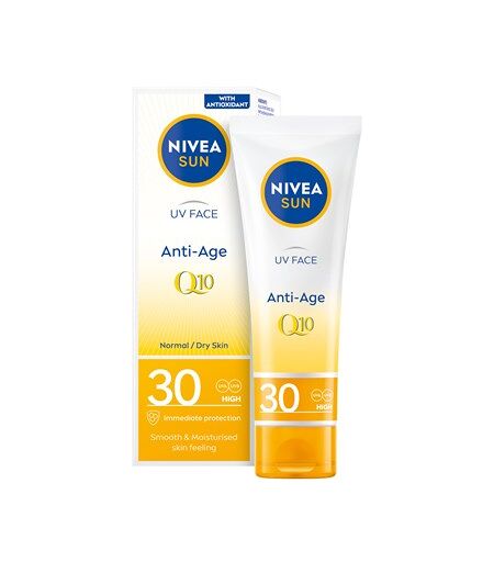 NIVEA SUN UV Face Anti-Age Q10 Cream er specielt udviklet til sart ansigtshud. Denne solcreme beskytter sund hud udefra mod UVA/UVB-stråler og mod højenergi-synligt lys-effekter. Den beskytter også huden indefra takket være en kraftfuld naturlig antioxidant, der aktiverer hudens egen forsvarsmekanisme. Formlen med Q10 forhindrer og bekæmper forekomsten af solinducerede fine linjer, rynker og pigmentpletter. Udviklet til normal/tør hudtyper. Den lette formel giver en glat hudfornemmelse, og gør denne solcreme ideel til daglig brug. Formlen er oftalmologisk godkendt (aka øjenvenlig). Hudkompatibilitet dermatologisk godkendt. NIVEA SUN sigter mod at minimere påvirkningen af miljøet. Formlen er 74% biologisk nedbrydelig og respekterer havet ved at være fri for UV-filtre Octinoxate, Oxybenzone & Octocrylene og fri for Microplastic. Tuben og låget er lavet af 50% genbrugsplast. Kassens emballage er nøje udvalgt og FSC godkendt. ...