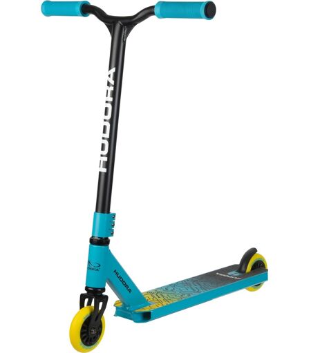 Stuntscooter Kids fra Hudora er designet til at imødekomme behovene hos børn i alderen 6-10 år. Det forstærkede styr i BMX-form med en bredde på 82,5 cm er let at styre, især for små ryttere. Det brede, skridsikre løbebræt af T5 aluminium sikrer et sikkert fodfæste. De højrebound hjul (100 x 24 mm) kombineres med ABEC 9 kuglelejer, mens manganstålbagbremsen pålideligt bremser scooteren, når det er nødvendigt. Denne scooter kan bruges op til en ryttervægt på 100 kg. ...