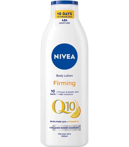 Nivea Q10 Firming Body Lotion er en bodylotion med Collagen Boost Complex samtr ren Q10 og C-vitamin, arbejder målrettet på at opstramme og forbedre hudens elasticitet. Allerede efter 7 dage vil huden føles fastere og mere spændstig, mens den samtidig bliver intensivt fugtet i op til 72 timer – klinisk dokumenteret. Den lette formel absorberes hurtigt og efterlader en blød, glat og behagelig fornemmelse, uden at fedte. Med en dermatologisk godkendt sammensætning og en flaske fremstillet af 50% genbrugsplast, giver den dig både smuk hud og en god samvittighed. Fordele: Bodylotion Strammer synligt huden op Forbedrer dens elasticitet på 7 dage Fugter huden i 72 timer - klinisk bevist Absorberes hurtigt og giver en behagelig fornemmelse Anvendelse: Påføres hele kroppen efter behov ...
