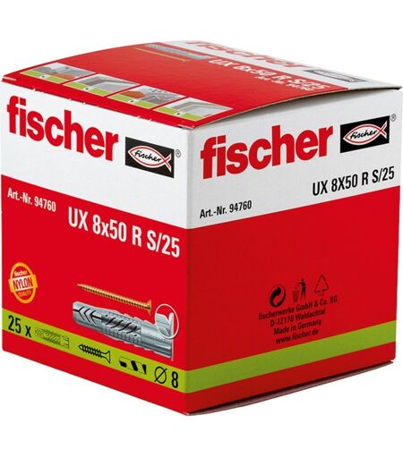 Fischer universal dowel UX R S er en plastikdyvel med kant lavet af nylon af høj kvalitet, inkl. skrue. Universaldyvelen breder sig i solide byggematerialer og knuder i hule og præfabrikerede byggematerialer for maksimalt hold. Det betyder, at fischer UX altid er det rigtige valg, selv med et ukendt byggemateriale. De skrå forbindelsesstænger på UX sikrer optimal skruestyring, og savtandformede anti-twist-enheder forhindrer rotation i borehullet. Dette opnår den størst mulige installationspålidelighed. De medfølgende skruer sikrer optimalt greb. Kanten forhindrer dybere glidning under montering. Fischer universal dowel UX anbefales for eksempel til fastgørelse af armaturer, gardinskinner, lette skabe og fodpaneler. ...