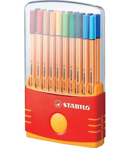 Stabilo Point 88 – Europas mest solgte finelinerFinelineren Point 88 fra Stabilo er en alsidig filtpen i høj og god og det er med god grund at pennens ergonomiske 6-kantede form med hvide striber er kendt og elsket over store dele af verden. Finelineren er super velegnet til mange forskellige typer opgaver i dagligdagen, både på uddannelsesintuitioner og skoler, i erhvervslivet og på kontoret, samt i hjemmet.Point 88 har en smal stregbredde på kun 0,4 mm og har samtidig en robust metalindfattet skrivespids, som forhindrer at kan blækket smitter af på kanterne når pennen bruges sammen med linealer og skabeloner. Samtidig giver finelineren en blød og præcis skrift, samt et ensartet blækflow, på grund af det gennemprøvede kapillarsystem.Stabilo Point 88 indeholder lugtfrit blæk fremstillet på vandbasis, og indeholder ingen konserveringsmidler eller farlige opløsningsmidler. Blækket indeholder desuden førsteklasses farvestoffer, hvilket giver Stabilo Point 88 lyskraft, brillans og farvestyrke.Sæt med 20 farverStregbredde: 0,4 mmVandbaseret blækErgonomisk 6-kantet grebForstærket metalspidsGod til linealer og skabeloner ...