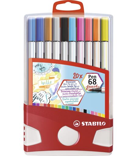 Højkvalitets tusser med fleksibelt pensel-spids – dækker et bredt kreativt spektrumMed Pen 68 penseltusserne fra Stabilo kan både begyndere og øvede kunstnere lave vidunderlige billeder og penselskrift, som giver dine bullet journals, lykønskningskort og andre gør-det-selv-projekter et smukt, farverigt look med fantastisk dækning.Takket være den fleksible penselspids har du en fornemmelse for trykket med det samme. Ved at variere trykket på spidsen kan du bruge penslen til at lave tykke eller tynde streger på papiret og er derfor ideel til mange kreative teknikker.Du får 20 farveintensive fiberpenne, som giver strålende og lysintense resultater, som du vil være stolt af at vise frem. Dertil indeholder tusserne vandbaseret blæk, hvor tusserne også efterlades uden låg i op til 24 timer uden at tørre ud – perfekt hvis det kreative projekt tager lidt længere tid.Tusserne kommer med et smart og praktisk indstikssystem, som gør det hurtigt og bekvemt at tage en pen ud og være kreativ. Derudover er pen-kassen med til at gøre tusserne nemme at transportere takket været plastiskdækslet med smart lukkemekanik.Tip: Takket være det vandbaserede blæk kan du skabe imponerende og magiske akvareleffekter med en pensel og lidt vand – Hold blot spidserne af to penne ved siden af hinanden for at skabe unikke farveforløb.Sæt med 20 farverAssorterede farverSkrivebredde: 1 mmVandbaseret blækKan ligge uden hætte i op til 24 timer ...