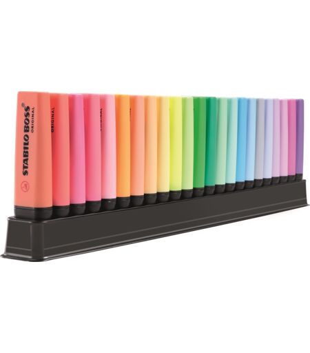 Få nemt overblikket med Stabilo Boss overstregningspenne!En highlighterpen er perfekt til enhver, der læser tekster og skal koncentrere sig om væsentlige informationer. Du får her et stort og praktisk sæt med hele 23 forskellige farver, som spænder både over de klassiske fluorescerende pangfarve og de mere dæmpede og elegante pastelfarver. Stabilo Boss overstregningspenne er meget populære, og med god grund! Highlighternes blæk er meget tydeligt og tværer ikke blæk ud. Derfor er Stabilo Boss tekstlinerne det oplagte valg til overstregning på papir, kopi og fax.Stabilo Boss highlighternes firkantede og buttede form gør det nemt at få et godt greb om pennen. De findes i mange farverige varianter, og her får du et stort og flot jubilæumssæt med hele 23 forskellige farver. De store sæt kommer i smart og praktisk bordstander, som fint kan stå på skrivebordet, så du altid har en overstregningspen lige ved hånden. De 23 forskellige farver giver dig også rig mulighed for hurtigt og nemt at farvekode og strukturere dine overstregninger. Sæt med 23 farverIndeholder både klassiske pangfarver og dæmpede pastelfarverVandbaseret blækLang holdbarhedCap off tid: Op til 4 timerStregbredde når pennen holdes vandret: 5 mmStregbredde når pennen holder lodret: 2 mm ...