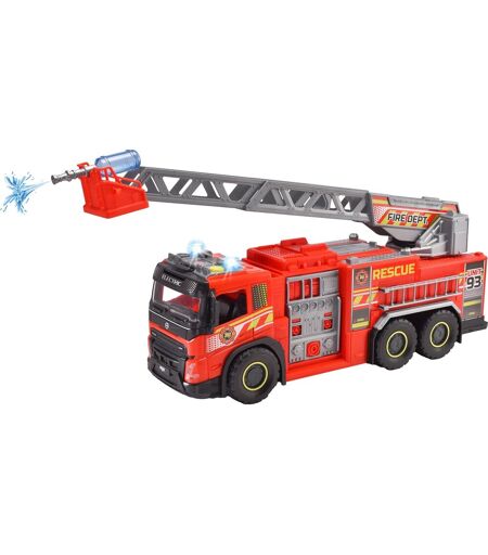 Videre til næste mission - med den gigantiske brandbil fra Dickie! Denne Volvo FMX-vildtbrandbil i skala 1:16 har en fantastisk lys- og lydfunktion og mange virkelighedstro detaljer. Stigen kan trækkes ud og drejes - en af de to medfølgende vandflasker kan fastgøres til kurven for enden af stigen, hvilket giver lastbilen en realistisk vandsprøjtefunktion. ...