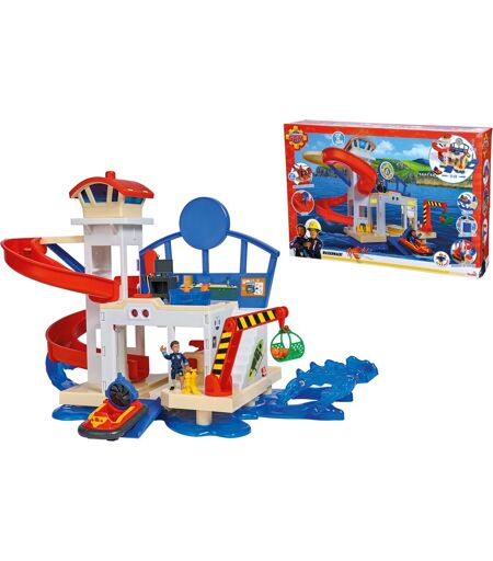 Vandvagten fra serien Fireman Sam er driftscenter for vandredning. Derfra kan de modige brandmænd starte deres operationer i vandet. Det har en helikopterlandingsplads, hvor helikopterne kan lande og lette. Via rutsjebanen kan brandfolkene hurtigt nå den laveste platform og betjene kranen med sikkerhedsnettet derfra. Vandskærmen har to forskellige gode lyde, der kan tændes med et tryk på en knap. Via den hvide rampe kan det medfølgende luftpudefartøj glide i vandet og skynde sig direkte til den næste mission. Luftpudefartøjet giver plads til en figur. Ud over vandskærmen indeholder sættet også en Jodie-figur og adskillige tilbehør. Velegnet til børn fra tre år. ...