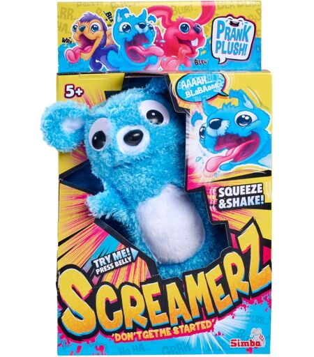 Fluffy pels, fremspringende ører, store googly øjne: Simbas ScreamerZ ser sød og nuttet ud - men hvis du klemmer eller ryster dem, får du en overraskelse! Med et let pres på maven laver de høje lyde. Hvis du trykker lidt hårdere, begynder de at skrige højt. Og når de bliver rystet, slipper de et sjovt, vaklende skrig ud. ScreamerZ er sjove små stipendiater, der har det tykt bag ørerne! Bjørnen er ingen undtagelse: Med sin babyblå pels er den en fantastisk kælen følgesvend med en overraskelseseffekt. ...