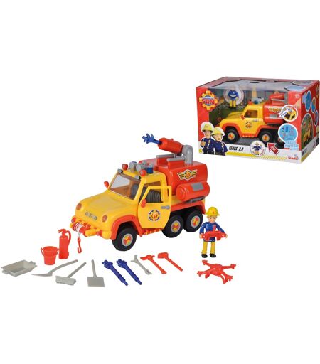 Venus brandbil er et populært udrykningskøretøj for brandmand Sam og hans team i Pontypandy og har fået et nyt look i serien. Venus 2.0 har nye friske farver og større hjul. Knappen på førerhuset aktiverer den oprindelige lyd, og det blå lys begynder at gløde. Batterier 2x 1,5V R03 er inkluderet i sættet. Til dette formål har brandbilen en vandkanon på taget, som børnene kan skyde vandpile med. Venus har mange rum til opbevaring af alle brandvæsenets redskaber. Vandtankene på siden kan trækkes ud, og bagagerummet og dørene kan åbnes. I den nederste bagagerum er der også en aftagelig drone. Den 19 cm venus 2,0 brandbil styres af brandmand Penny. Det er inkluderet som en figur i sættet sammen med mange tilbehør. ...