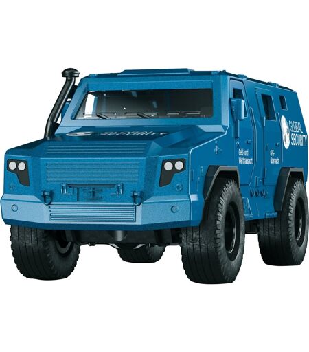 Den originale Rheinmetall Survivor cash transporter er et specielt køretøj i en klasse for sig selv med sit pansrede stålkabine og 4x4 lastbilchassis. I kabinen er selv den mest eksklusive last 100 procent beskyttet. SIKU-modellen er ubemærket malet i metallisk blå, siderne er trykt med logoet "Global Security". Dørene på begge sider såvel som bagpå kan åbnes. Med de medfølgende klistermærkeark kan køretøjet designes yderligere, for eksempel med instruktionerne "Penge- og værditransport" og "GPS overvåget" på forskellige sprog. Andet tilbehør såsom fire små guldbarrer og fire papark med andre spilelementer sikrer realistisk sjov. Et særligt højdepunkt: To af paparkene er trykt, i de to andre vises kun konturerne, så de enkelte elementer selv kan males og kreativt designes. ...