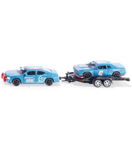 Racingset med 8-cylindrig effekt. Vilken kombination! Vilket designarbete! På bilvagnen drar Dodge Charger Dodge Challenger SRT Racing till nästa bantest. Vagnen lutas långsamt bakåt, och det himmelblå V8-monsteret rullar bakåt. Dörr öppen, slutliga instruktioner till föraren. Startnummer 42 rensas för att starta uppvärmningen. Bilen brusar ut ur pitbanan på banan. De gummierade hjulen på de sportiga fälgarna värms upp till driftstemperatur och sedan: Gasen och släpp 700 hk. Vroom! Skala 1:55 ...