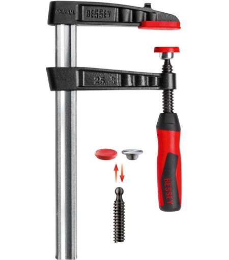 BESSEY TG25-2K skrueklemmen opnår en klemkraft på op til 6.000 N. Det har forstærkede formbare støbejernsbeslag, både øvre og nedre dele er lavet af formbart støbejern af høj kvalitet og forstærket af aksler. Den karakteristiske akselprofil fungerer som en pålidelig forstærkning mod vridningskræfter. Bessey hulprofilskinne af høj kvalitet fra virksomhedens eget tegneværksted er specielt optimeret til klemmer. Den 6-fold korrugering forhindrer effektivt skrueklemmen i at glide. Den integrerede BESSEY glidebeskyttelse, som alle formbare støbejernsskrueklemmer fra 80 mm projektion, sikrer også maksimal sikkerhed under fastspænding. En gevindstift i glidebeslaget når ind i skinnesporet, hvilket effektivt forhindrer klemmen i at løsne eller glide. Pulverlakeringen beskytter dem effektivt mod korrosion. Trykpladen, som kan udskiftes uden værktøj, kan udskiftes meget bekvemt og hurtigt, hvis det kræves. ...