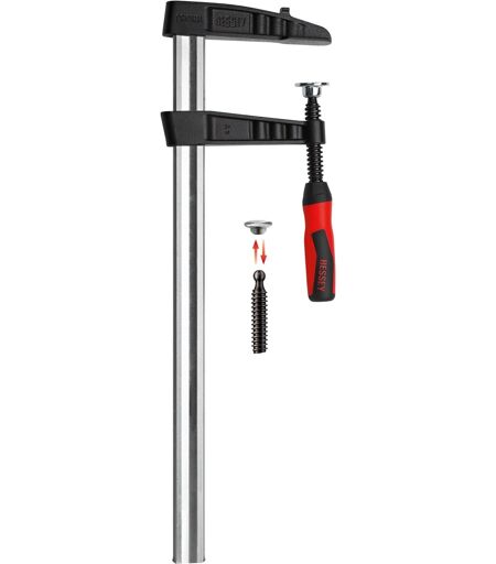 BESSEY TGK100-2K skrueklemmen opnår en klemkraft på op til 7.000 N. Det har forstærkede formbare støbejernsbeslag, både øvre og nedre dele er lavet af formbart støbejern af høj kvalitet og forstærket af aksler. Den karakteristiske akselprofil fungerer som en pålidelig forstærkning mod vridningskræfter. Bessey hulprofilskinne af høj kvalitet fra virksomhedens eget tegneværksted er specielt optimeret til klemmer. Den 6-fold korrugering forhindrer effektivt skrueklemmen i at glide. Den integrerede BESSEY glidebeskyttelse, som alle formbare støbejernsskrueklemmer fra 80 mm projektion, sikrer også maksimal sikkerhed under fastspænding. En gevindstift i glidebeslaget når ind i skinnesporet, hvilket effektivt forhindrer klemmen i at løsne eller glide. Pulverlakeringen beskytter dem effektivt mod korrosion. Trykpladen, som kan udskiftes uden værktøj, kan udskiftes meget bekvemt og hurtigt, hvis det kræves. ...