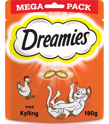 Dreamies kattegodbidder med smag af kyling 180 gramSkal katten forkæles med lækre godbidder, så er Dreamies snacks en hver kats drøm. Prøv bare at ryst posen og se hvordan din kat kommer løbende. Dreamies kattesnacks har en sprød skal og et cremet fyld med smag af kylling. Godbidderne indeholder ingen kunstige smagsstoffer.Mængde: 180 gramTil killinger og voksne katteTilsat vitaminer og mineralerIngen kunstige smagsstofferKun 2 Kcal per godbidFodervejledning:Til voksne katte: giv op til 20 bidder per dag. Til killinger: giv op til 6 bidder per dag. Tilpas hovedmåltidet med tilsvarende. Åbnet emballage skal opbevares tætlukket og bruges inden 8 uger. En skål med friskt vand skal altid være tillgænglig. Opbevares koldt og tørt.Tilsætningsstoffer per kg: Antioxidanter og Farvestoffer; Tilsætningsstoffer: Vitamin A: 6460 IE, Vitamin B₁: 9.9 mg, Vitamin B₂: 16.9 mg, Vitamin B₆: 4.4 mg, Vitamin D₃: 713 IE, Vitamin E: 64.8 mg, Kopparsulfat pentahydrat: 26.7 mg, Mangansulfat monohydrat: 43.4 mg, Kaliumjodid: 2.2 mg, Zinksulfat monohydrat: 193 mg.Sammensætning: Korn, kød og animalske biprodukter (hvoraf 4% kylling), olier & fedtstoffer, mineraler, vegetabiliske biprodukter. ...