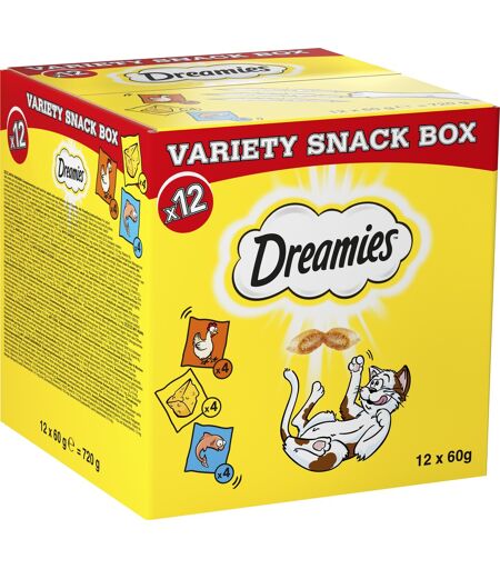 Dreamies kattegodbidder variationsboks med oste-, kyllinge- og laksesmag 12 x 60 gramSkal katten forkæles med lækre godbidder, så er Dreamies snacks en hver kats drøm. Prøv bare at ryst posen og se hvordan din kat kommer løbende. Dreamies kattesnacks har en sprød skal og et cremet fyld med smag af laks. Godbidderne indeholder ingen kunstige smagsstoffer. I denne pakke er der hele 3 smagsvarianter, så du kan variere smagen af godbidder.Mængde: 12 x 60 gramSmagsvarianter: Ost, kylling og laksTil killinger og voksne katteTilsat vitaminer og mineralerIngen kunstige smagsstofferKun 2 Kcal per godbidFodervejledning:Til voksne katte: giv op til 20 bidder per dag. Til killinger: giv op til 6 bidder per dag. Tilpas hovedmåltidet med tilsvarende. Åbnet emballage skal opbevares tætlukket og bruges inden 4 uger. En skål med friskt vand skal altid være tillgænglig. Opbevares koldt og tørt.Tilsætningsstoffer per kg: Kylling: Antioxidanter og farvestoffer; Tilsætningsstoffer med ernæringsmæssige egenskaber: Vitamin A: 1293 IE, Vitamin B₁: 9.9 mg, Vitamin B₂: 16.9 mg, Vitamin B₆: 4.4 mg, Vitamin D₃: 143 IE, Vitamin E: 115 mg, Kobber (Kobber(II)sulfat, pentahydrat): 6.1 mg, Jod (Kaliumjodid): 1.5 mg, Mangan (Mangan-(II)-sulfat, monohydrat): 14.1 mg, Zink (Zinksulfat, Zinksulfatmonohydrat): 70.5 mg. Ost: Antioxidanter og farvestoffer; Tilsætningsstoffer med ernæringsmæssige egenskaber: Vitamin A: 1293 IE, Vitamin B₁: 9.9 mg, Vitamin B₂: 16.9 mg, Vitamin B₆: 4.4 mg, Vitamin D₃: 143 IE, Vitamin E: 115 mg, Kobber (Kobber(II)sulfat, pentahydrat): 6.1 mg, Jod (Kaliumjodid): 1.5 mg, Mangan (Mangan-(II)-sulfat, monohydrat): 14.1 mg, Zink (Zinksulfat, Zinksulfatmonohydrat): 70.5 mg. Laksesmag: Antioxidanter og farvestoffer; Tilsætningsstoffer med ernæringsmæssige egenskaber: Vitamin A: 1293 IE, Vitamin B₁: 9.9 mg, Vitamin B₂: 16.9 mg, Vitamin B₆: 4.4 mg, Vitamin D₃: 143 IE, Vitamin E: 115 mg, Kobber (Kobber(II)sulfat, pentahydrat): 6.1 mg, Jod (Kaliumjodid): 1.5 mg, Mangan (Mangan-(II)-sulfat, monohydrat): 14.1 mg, Zink (Zinksulfatmonohydrat): 70.5 mg; Tilsætningsstoffer: Laksesmag: 0.13 mg.Sammensætning: Sammensætning med kylling: korn, vegetabilske biprodukter, olier og fedtstoffer, kød og animaliska biprodukter (heraf kylling 4%), vegetabilsk proteinekstrakt, mineralstoffer. Sammensætning med ost: korn, vegetabilske biprodukter, olier og fedtstoffer, kød og animaliska biprodukter, vegetabilsk proteinekstrakt, mineralstoffer, mælk og mejeriprodukter (heraf tørret ostepulver 2.1%, svarende till 4% ost). Sammensætning med laksesmag: korn, vegetabilske biprodukter, olier og fedtstoffer, kød og animaliska biprodukter, vegetabilsk proteinekstrakt, mineralstoffer.Tilskudsfoder til voksne katte og killinger over 8 uger. ...