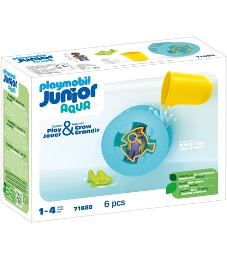Er du klar til sjove vandeksperimenter? Så er legesættene fra PLAYMOBIL Junior Aqua lige sagen. Vandhvirvelen med babyhaj bringer maksimal plaskeglæde til badekarret. Du skal blot fastgøre vandhjulet til kanten af badekarret eller flisen med sugekoppen, indsætte figuren og lukke døren. Hvis koppen nu er fyldt med vand, og vandet hældes i hjulbladene, begynder hjulet at bevæge sig. Den sjove hvirvlende tur begynder! ...