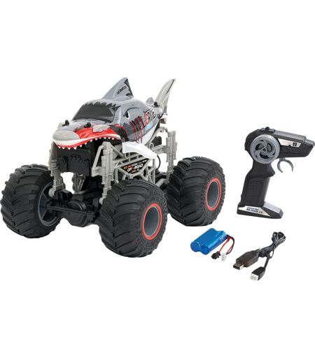 Slip Big Shark 2.0, monstertrucken blandt Revell RC-køretøjer løs, og hop ind i det sjove! Denne monstertruck model er designet til børn fra 8 år og kombinerer enestående design og bemærkelsesværdig teknologi. Med sit unikke haj-look er det et rigtigt blikfang, der tiltrækker opmærksomhed i ethvert terræn. Dens robuste gummidæk og præcise 2,4 GHz fjernbetjening giver dig mulighed for at spille i stort set hvor som helst. Big Shark opnår op til 15 minutters marchtid med det kraftfulde Li-Ion-batteri og hastigheder på op til 15 km/t. Batteriet er hurtigt klar til næste løb via USB. Big Shark 2.0 fra Revell er et imponerende fjernstyret legetøj med en uforglemmelig køreoplevelse. ...