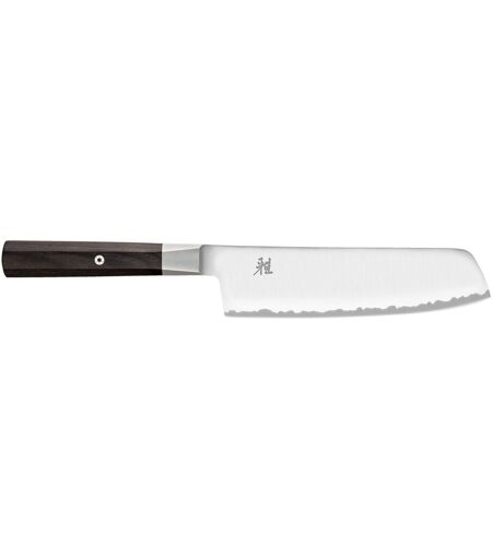 Nakiri fra MIYABI 4000FC serien med en bladlængde på 170 mm. Na betyder grøntsag og kiri betyder at skære på japansk, og hermed afsløres knivens primære formål. Kniven kan dog med fordel også bruges til at skære kød samt andre fødevarer. Inspirationen til denne knivserie er hentet fra det traditionelle japanske samuraisværd Katana. Bladlængde på 170 mm. Dobbelt FRIODUR ishærdet klinge med en hårdhed på ca. 61 Rockwell. Ottekantet skaft i smukt pakkatræ ...