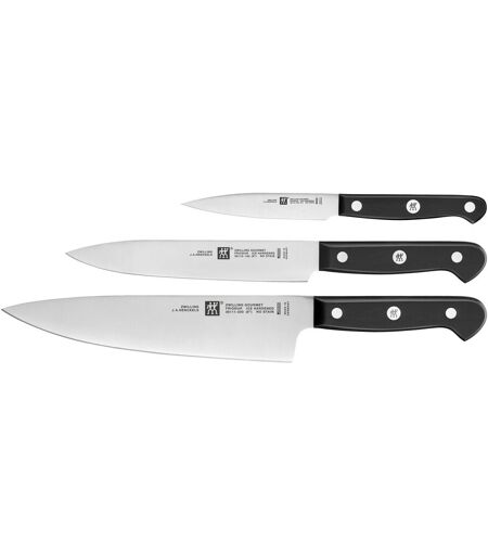 Det 3-delt knivsæt fra ZWILLING Gourmet-serien indeholder de køkkenknive, som du oftest har brug for til at lave lækre retter. Sættet indeholder en brugskniv (bladlængde 10 cm) til skrælning og skæring af grøntsager eller frugt og en udskærerkniv (bladlængde 16 cm) til nem udskæring af alle typer kød. Knivsættet fuldendes af kokkekniven (bladlængde 20 cm), som kan bruges til at hakke, klippehakke, dele eller skære. FRIODUR-bladene på køkkenknivene er ishærdede, hvilket gør dem utroligt robuste og korrosionsbestandige. Disse knive er også nemme at føre, da de er velafbalancerede og lette i vægt. Det gør madlavningen til en fornøjelse!. Robuste, korrosionsbestandige og fleksible knive af specielt rustfrit stål. Perfekt afbalanceret kniv til træthedsfrit arbejde. Ergonomisk plasthåndtag i tre-nitte-design med laseret ZWILLING-logo på den midterste nitte. Fremstillet i Solingen ...