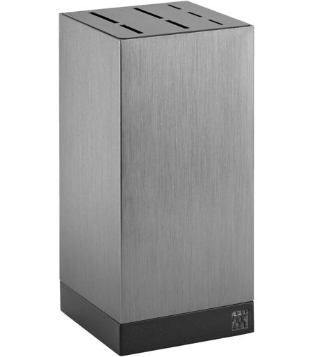 Knivblok i gråt børstet aluminium fra ZWILLING. Knivblokken har plads til op til syv køkkenknive: To store, to mellemstore og tre små knive med en klingelængde på op til 22 cm. Indsatsen til knivene er udført i træ for at skåne knivbladene. Indsatsen kan nemt tages af for let rengøring. Måler 25 cm x 12 cm x 12 cm. Fås også i sort. Børstet aluminium og træ. Med plads til op til 7 knive ...