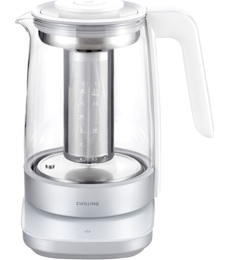 Elegant hvid ZWILLING Enfinigy elkedel i glas. Vejen til optimal te-nydelse begynder på 360 ° basestationen. Ved hjælp af forkogningsfunktionen kan kedlen først opvarme vandet til 100 ° C og derefter rapportere, når den ønskede temperatur er nået. Derefter hælder du simpelthen din te i te-indsatsen i rustfrit stål. Den integrerede te-timer signalerer med et bip, når teen har trukket i den indstillede tid. Der kan indstilles en brygningstid på mellem 0 og 10 minutter, alt afhængig af te-typen. Hvis den velfortjente tepause skal vente et øjeblik, kan teen opbevares ved den ønskede temperatur i 30 minutter med den praktiske hold-varm-funktion. Teindsatsen kan derefter fjernes med den integrerede holder i låget, frigøres med et tryk på en knap og placeres på den medfølgende drypbakke. Glaskedlen med en volumen på 1,7 liter kan ikke kun bruges til te. En babymadindsats er tilgængelig specielt til at forberede babymad og holde den varm. Den kan også bruges til at sterilisere sutter og flasker ved 100 ° C i 5 minutter. Den moderne designede kedel med glas er også let at rengøre. 10 programindstillinger og 6 temperaturniveauer (40 ° C, 60 ° C, 70 ° C, 80 ° C, 93 ° C, 100 ° C). Hold-varm-funktion holder temperaturen i 30 minutter. Te-timer og teindsats med holder i låget for nem fjernelse og matchende drypbakke. Forkogningsfunktionen varmer i første omgang op til 100 ° C. 360 ° basestation. Glasoverflade for let rengøring. Varmeelementer i rustfrit stål. Udviklet af ZWILLING i Tyskland, designet i Milano, Italien af Matteo Thun & Antonio Rodriguez. Babymadindsats sælges separat ...