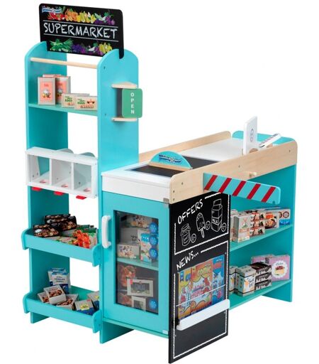 Sælg eller køb dig selv - alt er muligt med dette legetøjssupermarked lavet af MDF. Der er god plads i hylderne og i skabet til masser af varer, derudover er der tre rutsjebaner til mad, en disk som kasseområde med skab, tavle og betalingsterminal. Derudover inspirerer denne butik med fantastiske detaljer: en magasinholder til fastspænding af brochurer, et drejeligt åbne/lukke-skilt og en vareseparator til transportbåndet. Derudover er der 50 produktkasser og fem papirposer til et omfattende sortiment. ...