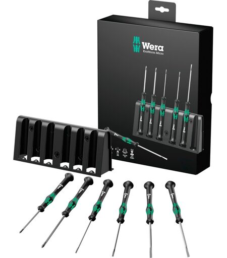 Wera 2035/6 B elektronisk skruetrækker erstatning Kraftform Micro + Rack med Black Point tip består af to phillips og fire slot skruetrækkere. Wera Black Point-spidsen og den komplekse hærdningsproces giver holdbarhed, nøjagtighed af pasform og optimeret korrosionsbeskyttelse. Multikomponentkraftformen Micro skruetrækkerhåndtag muliggør ergonomisk korrekt arbejde. Takket være den drejelige hætte og den hurtigsvingende zone under denne hætte er lynhurtig snurren mulig. Tidskrævende greb som med konventionelle drejebænke med fine øjne er ikke længere nødvendigt uden udskiftning. Præcisionszonen direkte over bladet giver brugeren en god fornemmelse for den rigtige rotationsvinkel under justeringsarbejdet. Håndtagsmærket "Tag det roligt" med farvekodning i henhold til profiler gør det også lettere at finde i værktøjstasken og på arbejdspladsen. Skruetrækkersættet leveres med et stativ, der kan placeres på arbejdsstationen. Dette sikrer korrekt opbevaring og hurtig adgang. ...