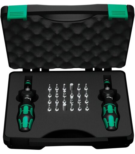 7440/41 Kraftform moment skruetrækker sæt 0,3-3,0Nm er et sæt på 26 dele. Den indeholder to justerbare momentskruetrækkere med forskellige drejningsmomentområder (0,3 - 1,2 Nm og 1,2 - 3,0 Nm) og højeste nøjagtighed samt 24 bit. Den krævede momentværdi kan nemt justeres manuelt uden værktøj, og skalaværdien er let at læse. Målenøjagtigheden er ± 6% i henhold til DIN EN ISO 6789-standarden. Der er et klart hørbart og mærkbart overtag, når det indstillede drejningsmoment nås. 1/4" sekskantstikholderen med Wera quick-change chuck og Rapidaptor-teknologi sikrer lynhurtige bit- eller møtrikskift og sikkert greb om bitene. Sekskantstikbitene har Wera Hex-Plus-profilen. Det giver større installationsområder i skruehovedet, hakeffekten reduceres til et minimum, og ødelæggelsen af profilen forhindres. Samtidig kan op til 20% højere drejningsmomenter overføres. Med multikomponent-kraftformhåndtaget, der er udviklet af Wera, finder hele hånden kontakt med håndtaget, hvilket muliggør hurtigt og skånsomt arbejde. De hårde grebszoner sikrer høj arbejdshastighed, mens soft grip-zonerne tillader transmission med højt drejningsmoment. Sættet leveres i et robust plastikhus med en blød skumindsats. ...