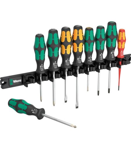 Wera 9650 Magnetstrimmel Kraftform skruetrækkersæt er et 9-delt skruetrækker all-round sæt. Det omfatter Phillips, Phillips Pozidriv, TORX, kærvskruetrækkere (værksteds- og elektrikerblade), to skruebits og en skruetrækker isoleret i henhold til VDE. Takket være den integrerede slaghætte kan de to skruebits også bruges til mejsling, mejsling og løsning af fastsiddende skruer eller skrueklemmer for at øge levetiden og reducere risikoen for splintring. Den sekskantede skruenøgle, der er svejset til klingen, gør det muligt at overføre endnu højere drejningsmomenter med en gaffelnøgle eller en ringnøgle. Med det flerkomponent Kraftform-håndtag, der er udviklet af Wera, kommer hele hånden i kontakt med håndtaget. De glatte, hårde zoner glider gennem hånden som hjul, når du skifter håndtag og muliggør særligt høje arbejdshastigheder. De skridsikre, bløde zoner er optimale kontaktflader for hånden og muliggør høj kraftoverførsel. Den sekskantede afrulningsbeskyttelse forhindrer irriterende rulning væk på skrånende overflader. Håndtagsmarkeringen med skruesymbol og håndtagsstørrelse gør det også nemmere at finde den ønskede størrelse i værktøjstasken og på arbejdspladsen. Nogle af skruetrækkerne har Wera Lasertip-klinger. Klingespidsen, der er specielt ru med laserteknologi, klør fast i skruehovedet og forhindrer det i at glide ud af skruehovedet. Spændelisten af aluminiumsprofil af høj kvalitet holder værktøjet sikkert på plads takket være stærke spændefjedre. Klemrækken kan fastgøres sikkert til alle metaloverflader takket være dens stærke magnet, eller den kan også skrues fast på en væg ved hjælp af de to skruehuller. ...