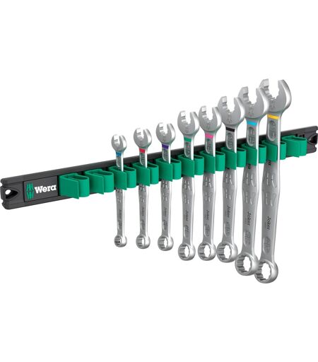Med sin intelligente åbne geometri udvider kombinøglen Joker 6003 fra Wera anvendelsesområdet betydeligt i trange installationsrum. Kombinationen af den 7,5° drejelige kæbe og den dobbelte sekskantgeometri gør det muligt at "pakke" møtrikker og bolthoveder hver 15°. Det betyder, at selv vanskelige skruesituationer, der tillader mindre end 30° drejevinkler, kan løses. Dette 8-delte sæt 9641 Magnetic Strip 6003 Joker 2 indeholder de vigtigste skruenøglestørrelser i tommestørrelser. Den slanke, men robuste ringside er vinklet 15° i forhold til værktøjsaksen for at forhindre skader. Den dobbelte sekskantgeometri på kæbe- og ringsiderne sikrer en formtilpasset forbindelse med skruehovedet eller møtrikken og reducerer risikoen for at glide. Overfladebehandlingen af høj kvalitet giver en høj og langvarig korrosionsbeskyttelse. Spændelisten af aluminiumsprofil af høj kvalitet holder værktøjet sikkert på plads takket være stærke spændefjedre. Klemrækken kan fastgøres sikkert til alle metaloverflader takket være dens stærke magnet, eller den kan også skrues fast på en væg ved hjælp af de to skruehuller. ...