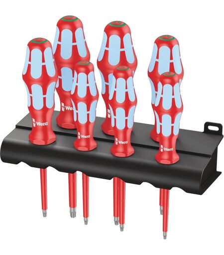 Wera 3167 i/7 TORX skruetrækkersæt, rustfrit stål + rack med VDE-testet isolering består af syv skruetrækkere med TORX profil. Enhedstest ved 10.000 volt i overensstemmelse med IEC 60900 sikrer sikkert arbejde, selv under spænding op til 1.000 volt. De er lavet af rustfrit stål, som undgår den grimme fremmede rust efter skruning. Weras værktøjer i rustfrit stål er vakuum-ishærdede og har således de hårdheds- og styrkeværdier, der kræves til skruetilslutninger. Industriel brug er mulig uden begrænsninger. Med multikomponent kraftformhåndtaget udviklet af Wera finder hele hånden kontakt med håndtaget. De glatte, hårde zoner glider gennem hånden som hjul, når de griber fat, og muliggør særligt høje arbejdshastigheder. De gribende, bløde zoner er optimale installationsoverflader for hånden og muliggør høj kraftoverførsel. Håndtagsmærkningen med skruesymbol og håndtagsstørrelse gør det også nemmere at finde i værktøjstasken og på arbejdspladsen. Skruetrækkersættet leveres med rack, der kan fastgøres til væggen. Dette sikrer korrekt opbevaring og hurtig adgang. ...