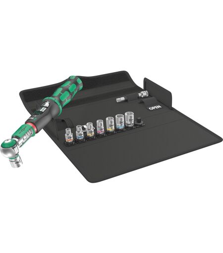 Det 10-delte Safe-Torque A1 Set 1 fra Wera er et 1/4" momentnøglesæt i en robust tekstilkasse. SafeTorque A 1 momentnøglen er udstyret med en glidemekanisme. Efter at have nået den indstillede drejningsmomentværdi kan værktøjet ikke belægges, således at anvendelsen af for højt drejningsmoment udelukkes. Justeringsområdet er fra 2 til 12 Nm, for kontrolleret højre og venstre dragt. Momentfunktionen kan også slås fra takket være Torque Lock-funktionen. SafeTorque momentnøglen kan derefter også bruges som en standard skralde med høje frigørelsesmomenter og i definerede rotationsvinkelapplikationer. Den ønskede momentværdi kan let indstilles og sikres. Det hørbare og taktile snap, når skalaværdierne er nået, letter også den sikre justering af det ønskede drejningsmoment. Skraldens returvinkel er kun 5°, så den også kan bruges i trange arbejdssituationer. De medfølgende hånd- og maskinstiknøgleindsatser med kuglefangerrille lavet af mat forkromet krom vanadium muliggør brug i manuel og maskindrift. Værktøjsfinderen "Tag det roligt" med farvekodning i henhold til størrelser bruges til nemt og hurtigt at finde den nødvendige plug-in-møtrik. Wera-bælterne kan fastgøres til velcrostrimlen i tekstilkassen i Safe-Torque A 1 Set 1. På denne måde kan yderligere plug-in møtrikker og / eller bitnødder rummes og tages med dig. ...