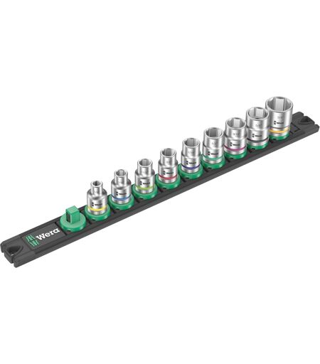B Imperial 1 møtrik magnetstrimle fra Wera med ni 1/4" hånd- og maskinstiknøgleindsatser (ikke-stød) i amerikanske tommer størrelser kan let fastgøres til værktøjsvognen til midlertidig brug, for eksempel. Den glatløbende rotationsmekanisme "Twist to unlock" sikrer et sikkert greb og samtidig nem fjernelse af plug-in-møtrikkerne. HMA Zyklop-stiknøgleindsatserne med kuglefangerrille og "Tag det roligt" værktøjsfinder har en farvekodning i henhold til størrelser for nem og hurtig at finde det nødvendige værktøj. Zyklop hånd- og maskinmøtrikker har en knurled i bagenden for højt greb, når du arbejder med hånden. De muliggør brug i manuel og maskindrift (uden stød), så du er udstyret til næsten alt arbejde med kun et plug-in møtrikområde. ...