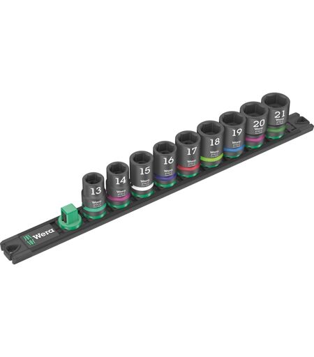 Magnetstrimlen C Impactor 1 fra Wera med ni 1/2" stiknøgleindsatser til slagnøgler kan f.eks. nemt fastgøres til værktøjsvognen til midlertidig brug. Den glatløbende rotationsmekanisme "Twist to unlock" sikrer et sikkert greb og samtidig nem fjernelse af plug-in-møtrikkerne. Slagnøgleindsatserne med boring og ringrille til en låsestift eller O-ring og "Tag det roligt" værktøjsfinder har en farvekodning i henhold til størrelser for nem og hurtig at finde det nødvendige værktøj. Impactor-møtrikkerne har en knurled i bagenden for højt greb, når du arbejder med hånden. De tillader brug med elektrisk eller trykluftdrevne slagnøgler med 12,5 mm (1/2") drev. Slaglegemeteknologien sikrer levetid over gennemsnittet selv under ekstreme krav. Den sekskantede profil muliggør høj effektoverførsel med samtidig præcision og beskyttelse af profilen. ...