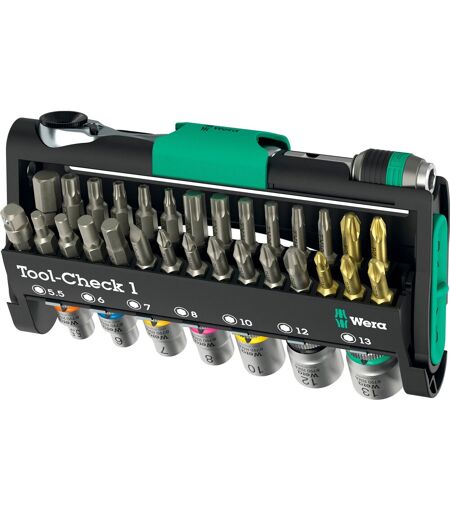 Wera Tool-Check 1 med 38 dele kombinerer skralde, bits og toppe på meget lidt plads. Sættet indeholder 28 bits, en Rapidaptor bitholder, en adapter (1/4" sekskant til 1/4" firkant), syv toppe (1/4"), en Wera Zyklop Mini Bit-skralde i sænksmedet massivt ståldesign, velegnet til at rumme bits med 1/4" eksternt sekskantdrev, brug af 1/4" toppe er også mulig via tilpasning med Wera Adapter 870/1. Fatningerne med "Take it easy" værktøjsfinder har en farvekodning efter størrelse, så det værktøj, du har brug for, hurtigt og nemt kan findes. Sekskantede bits har Wera Hex-Plus-profilen. Hex-Plus får sekskantskruer til at holde længere. Det giver større kontaktflader i skruehovedet, hvilket reducerer hakeffekten til et minimum og forhindrer ødelæggelse af profilen. Samtidig kan der overføres op til 20 % højere drejningsmomenter. Hex-Plus-værktøj passer ind i enhver standard unbrakoskrue. Fjernelse af bit er ekstremt praktisk med enhåndsåbningsmekanismen. Ved at trykke på skydekontakten åbnes bitkontrollen automatisk, bits og holdere kan nemt fjernes. Takket være fastgørelsesmuligheden til bæltet er Wera Tool-Check 1 altid med dig, selv når du er på farten. ...