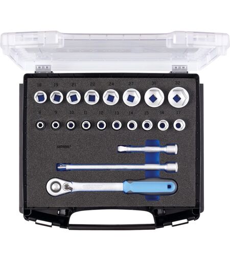 Det 21-delte 1/2" stiknøglesæt 2836084 fra GEDORE indeholder håndtagskoblingsnøglen 1993 U-20, to forlængere og smedede, hærdede, håndbetjente 6-kants stiknøgleindsatser. 1/2" omskifter skralde er lavet af GEDORE vanadiumstål 31CrV3, forkromet, fintandet (60 tænder), med vippehåndtag og trykknapudløser, har en drejevinkel på bagsiden på 6 grader og et skridsikkert 2-komponent håndtag med ophængshul. Stiknøglesættet 2836084 leveres i GEDORE i-BOXX 72 Nr. 1101 L. ...