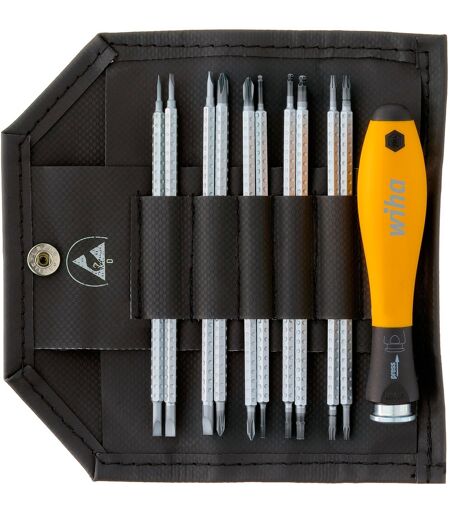 Skruetrækkeren med udskifteligt klingesæt SYSTEM 4 ESD består af et plug-in håndtag med 4 mm sekskantholder til alle SYSTEM 4-knive og ti dobbeltsidede udskiftelige knive. Håndtagets ESD-materiale spreder elektrostatisk energi på en kontrolleret og sikker måde. Skruetrækkerhåndtaget er fremstillet i overensstemmelse med den internationale standard IEC 61340-5-1 og giver dermed maksimal beskyttelse af de elektroniske komponenter. Skruetrækkeren har en overflademodstand på 106 - 109 ohm og er derfor ideel til fint og filigranskruearbejde på elektrostatisk truede komponenter. Det ergonomiske SoftFinish skruetrækkerhåndtag muliggør en optimal overførsel af håndkraft. Når du skruer manuelt, er håndled og muskler tungt belastede i det lange løb. Den særligt ergonomisk formede SoftFinish skruetrækker giver et middel her. Placeringen af de hårde og bløde zoner på håndtaget understøtter perfekt adgang under hurtig og kraftig drejning. Bladlængden kan varieres fra 18 - 90 mm via den jævnt kørende låse- og oplåsningsknap. ClickStop kugleklemmen sikrer et sikkert greb og hurtigt bladskift til enhver tid. Skruetrækkeren med udskifteligt klingesæt SYSTEM 4 ESD er ideel til alt præcisionsarbejde inden for elektronik og mekanik. ...