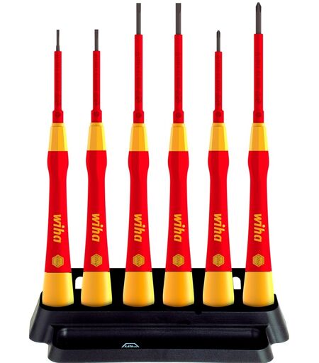 42989-sættet fra Wiha indeholder seks PicoFinish elektriske finskruetrækkere i forskellige profiler og størrelser samt en praktisk plastholder til ophængning eller stående. De isolerede skruetrækkere testes individuelt ved 10.000 volt AC- og GS-test og muliggør sikkert arbejde i området for strømførende dele op til 1.000 volt AC. Takket være deres lange, slanke håndtag og hurtigdrejningszonen er PicoFinish fine skruetrækkere eller elektroniske skruetrækkere ideelle til fint og filigranarbejde inden for el, strømførende dele og præcisionsmekanik samt i hobby- og modelbygningssektoren. Det ergonomiske håndtagsdesign med blød zone giver komfortabelt arbejde, og den glidende roterende hætte understøtter hurtig og følsom drejning. Udfordringen med præcisionsmekaniske fittings er at arbejde meget præcist og følsomt uden at beskadige det følsomme emne. De trykte skruetrækkersymboler på den roterende hætte gør det nemt at vælge den korrekte skruetrækkerprofil i værktøjstasken. ...