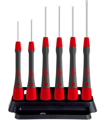 Sættet 42997 fra Wiha indeholder seks TORX finskruetrækkere PicoFinish i forskellige størrelser og en praktisk plastikholder til ophængning eller stående. Takket være deres lange, slanke håndtag og den hurtige drejezone er PicoFinish fine skruetrækkere eller elektroniske skruetrækkere ideelle til fint og filigranarbejde inden for præcisionsmekanik såvel som i hobby- og modelfremstillingssektoren. Det ergonomiske håndtagsdesign med blød zone giver komfortabelt arbejde, og den glidende roterende hætte understøtter hurtig og følsom drejning. Udfordringen med præcisionsmekaniske fittings er at arbejde meget præcist og følsomt uden at beskadige det følsomme emne. De trykte skruetrækkersymboler på drejehætten gør det nemt at vælge den korrekte skruetrækkerprofil i værktøjstasken. ...