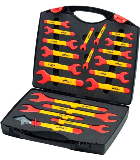 Med enkeltmunds gaffelnøglesættet inklusive rullegaffelnøgle er elektrikere ideelt udstyret til at arbejde på strømførende elektriske systemer. Med en mundposition på 15° er de isolerede enkeltmundede gaffelnøgler velegnede til installation af klemmer og stikkontakter selv ved flaskehalse. Den også medfølgende rullegaffelnøgle, også kaldet engelsk, har en maksimal åbningsbredde på 30 mm og er variabel og trinløs justerbar med knurled skrue. Skader på følsomme overflader minimeres af de særligt glatte og parallelle kæber. Værktøjerne, der er inkluderet i sættet, udsættes for stykketest i overensstemmelse med den internationale standard IEC 60900 og muliggør sikkert arbejde i området for strømførende dele op til 1.000 volt AC. Skruenøglerne bruges til sikker installation af klemmer og stikkontakter, lederforbindelser og til skruning af samleskinner. Sættet er anbragt i en robust kasse med skumindsats. ...