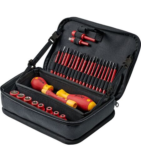 SoftFinish electric slimVario Set 43465 fra Wiha med 32 dele indeholder forskellige isolerede softfinish elektriske slimvario skruetrækkerbitholdere, stiknøgleindsatser og 6 mm slimBits. Den særligt ergonomisk formede SoftFinish-skruetrækker med hårde og bløde zoner på håndtaget understøtter perfekt adgang under hurtig og kraftig drejning. Takket være den samlede længde på kun 105 mm er det ekstra stumpede plug-in-håndtag perfekt til at arbejde ved flaskehalse. I Wiha slimTECHNOLOGY, der er specielt udviklet til elektrisk arbejde, er den beskyttende isolering integreret i knivene for at muliggøre op til 33% slankere knive. På denne måde kan selv lavtliggende skrue- og fjederelementer nås ubesværet. Håndtaget, det stumpede håndtag og 6 mm slimBits er individuelt testet ved 10.000 volt AC- og GS-testet og muliggør sikkert arbejde i området for strømførende dele op til 1.000 volt AC. De er velegnede til alt skruearbejde, f.eks. montering af stikkontakter, arbejde i styreskabet, vedligeholdelse og reparation af motorapparater og husholdningsapparater, varme-, klimaanlæg og sanitære installationer, reparation af cykler, motorcykler og plæneklippere, også til møbelkroppe og andre skrueopgaver i hobbysektoren. Sættet kommer i en praktisk funktionel taske. ...