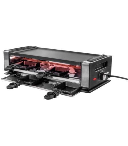 Med Raclette Delice Basic serveres kulinarisk mangfoldighed for op til 8 personer. Ud over de 8 non-stick pander og 8 plastspatler er der også inkluderet en vendbar trykstøbt aluminiumsgrillplade med en glat eller riflet overflade. Takket være non-stick belægningen af høj kvalitet er den nem at rengøre. Uanset om ost smelter mørt, bøffer skal steges kraftigt eller grøntsagsskiver skal grilles: Med 1.200 watt sikrer den uendeligt variable temperaturregulering med indikatorlampe altid den perfekte varmeudvikling af varmeelementet i rustfrit stål. Hvis du elsker hyggelige racletteaftener, men ikke finder lugten så prikkende den næste dag, bør du købe den valgfrit tilgængelige røgfri hætte. Selvfølgelig har Raclette Delice Basic indehaveren til dette at tilbyde! Den udtrækkelige pandebakke i rustfrit stål er praktisk: panderne kan placeres på den under en raclettepause. På de skridsikre fødder har Raclette Delice Basic med integreret kabelopbevaring altid et sikkert stativ. ...