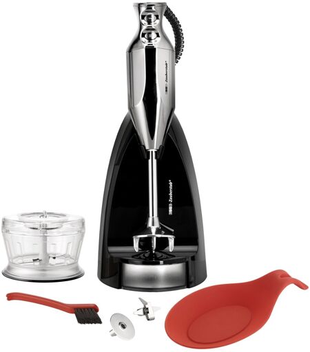 Ledsaget af masser af tilbehør præsenterer ESGE tryllestaven M 200 Chrome sig i sit stilfulde krom-outfit. Multikniv og slagskive kan opbevares i den kompakte magiske base, hvor staven altid er ved hånden. Pakken indeholder også shredder til urter, nødder, chokolade eller parmesan. Som standard er der også en silikone opbevaringsbakke til brugte køkkenredskaber - og den praktiske rengøringsbørste, som clip-on delene kan rengøres med på ingen tid. Takket være sikkerhedskontakten er der enten 12.000 eller 17.000 omdrejninger i minuttet til rådighed – intet problem for den holdbare, robuste vekselstrømsmotor "Made in Switzerland". ESGE tryllestaven er mobil og komfortabel takket være spiralkablet, der kan forlænges op til 150 centimeter, og clip-on-midten, som gør det nemt at fastgøre tilbehøret. ...