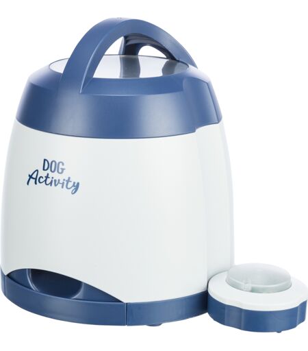 Nye udfordringer for krop og sind: Trixie Dog Activity Memory Trainer 3.0 er en udfordrende strategileg, der går ud på at din hund skal gøre sig fortjent til lækre belønninger. Når din hund trykker på den separate udløser, kvitterer foderautomaten med en snack, og motiverer dermed din hund til at fortsætte legen. Den skridsikre foderautomat af robust plastik kan fyldes med godbidder eller tørfoder. For at regulere doseringen, kan du indstille snackbeholderens åbning indvendigt i automaten. Udløseren er en stor knap, som kan aktiveres ved hjælp af poten eller snuden. Den kan placeres direkte på foderautomaten, og siden sættes længere væk, i takt med at hunden bliver fortrolig med apparatet. Sensorens rækkevidde er 40 m, hvilket giver dig gode muligheder for at udfordre din hund på forskellige måder. Det er også muligt at placere begge komponenter i forskellige rum, for rigtigt at holde din hund på stikkerne. Med den separat tilgængelige fjernbetjening kan du udløse maskinen eksternt og træne kommandoer eller det at være alene. Sådan fungerer Trixie Dog Activity Memory Trainer 3.0: Den første udfordring for hunden består i at forstå sammenhængen mellem foderautomaten og udløseren. Når hunden trykker på den store knap, høres en signaltone. Din hund lærer hurtigt denne tone at kender. Den signaliserer nemlig, at der venter en godbid i snack-bakken. Hvis du har to hunde, kan hver hund få sin egen signaltone, så du kan træne dem individuelt. Når din hund har forstået forbindelsen mellem udløseren og snack-bakken i automaten, kan du gøre opgaven sværere ved hele tiden at flytte rundt på udløseren, så den kommer længere og længere væk fra snack-bakken. Selvom gulvet er glat, står udløserknappen fast takket være den medfølgende plastikholder. Du kan også fastgøre udløserknappen på græsplænen ved hjælp af den medfølgende pløk, ligesom sættet indeholder en sugekop, så du kan sætte udløserknappen fast på vinduet. Den medfølgende brugsanvisning forklarer dig i alle detaljer, hvordan du sikrer dig, at din hund opnår den størst mulige indlæringseffekt. Herunder detaljerede beskrivelser af de forskellige indlæringsfaser og opstillingsmuligheder, hvilket gør det lettere og mere effektivt for dig at bruge Trixie Dog Activity Memory Trainer 3.0. Trixie Dog Activity Memory Trainer 3.0 kort: Interaktivt, udfordrende intelligenslegetøj med forskellige sværhedsgrader Kan bruges sammen med snacks eller hundens normale tørfoder Innovativ foderautomat med variable sværhedsgrader: Din hund belønnes med en snack fra automaten, så snart den trykker på den separate udløser. For at gøre legen rigtig udfordrende, kan udløserknappen anbringes op til 40 meter væk fra automaten. Med mange forskellige anbringelsesmuligheder: den medfølgende pløk gør det muligt at fastgøre udløserknappen i græs eller grus, mens sugekoppen lade dig anbringe udløserknappen på vinduer og andre glatte overflader. Endelig modtager du også en gummiholder, som sørger for at udløserknappen står godt fast på... ...