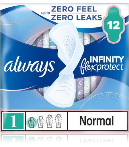 Always Infinity Normal Size 1, 12 stk., Hygiejnebind til kvinder , Egenskaber: vinger, der beskytter dine trusser mod uønskede pletter en ideel størrelse til dage med let blødning en absorberende kerne, der sikrer, at væsken bliver inde i bindet meget åndbart ...