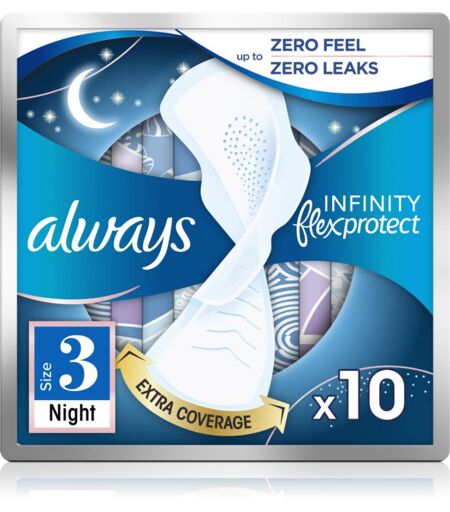 Always Infinity Night Size 3, 10 stk., Hygiejnebind til kvinder , Egenskaber: vinger, der beskytter dine trusser mod uønskede pletter en ideel størrelse til at bruge om natten en ideel størrelse til dage med ekstra kraftig blødning en absorberende kerne, der sikrer, at væsken bliver inde i bindet ...