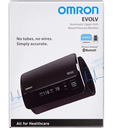 Omron Evolv er en blodtryksmåler, der måler blodtrykket meget sikkert. Manchetten er fastgjort til overarmen. Målinger kan læses straks. Omron Connect-appen gør det også muligt at læse målinger fra en smartphone eller tablet. Forskellige målinger kan nemt sammenlignes Armmanchetomkreds passende til apparatet: 220-420 mm. Bemærkning Præformet manchet.Signal når den placeres ukorrekt.Signal når en uregelmæssig hjerterytme opdages.Op til 100 målinger gemt i hukommelsen.Sammenlign målinger med Omron Connect app via smartphone eller tablet.Inklusiv bæretaske. Dosis og anvendelse Når du foretager en måling på højre arm, skal luftslangen sidde på siden af din albue. Pas på ikke at hvile armen på luftslangen.Blodtrykket kan variere mellem højre og venstre arm, hvilket kan medføre forskellige måleværdier. Foretag altid målinger på samme arm. Hvis værdierne mellem armene afviger væsentligt, skal du spørge lægen, hvilken arm du skal bruge til målingerne.Når du bruger en lysnetadapter (ekstraudstyr), må apparatet ikke placeres på et sted, hvor det er vanskeligt at sætte lysnetadapterens stik i stikkontakten eller tage det ud.Apparatet er primært beregnet til hjemmebrug. ...