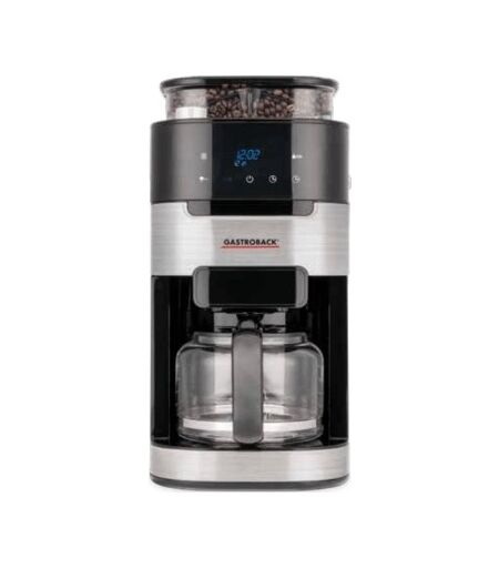 Gastroback 42711 Kaffemaskine med grinderMed denne kaffemaskine fra Gastroback med indbygget kværn, er det intet problem at lave en god, velsmagende kop kaffe. På toppen har den en kaffebønnebeholder som har plads til 250 gram bønner og i maskinens vandbeholder kan der være hele 1.5 liter vand, svarende til 12 kopper. Kværnen har 8 indstillinger for hvor groft bønnerne skal males og det er muligt at justerer om smagen skal være mild, medium, eller stærk. Det er selvfølgeligt også muligt at benytte kaffe som allerede er malet i denne maskine og maskinen kan holde kaffen varm i op til 30 min efter kaffen er færdig brygget inden den selv slår fra.Med indbygget timer via touch funktionen på fronten af maskinen, gør at du kan sætte den til at lave kaffe 24 timer frem, så du kan aftenen før sætte den til at have lavet kaffe til du står op næste morgen.Maskinen benytter 1/4 kaffefiltre men der medfølger et permanent filter til maskinen som skal rengøres hver gang det har været brugt. Vandindikator findes på siden af maskinen.Hvis du ikke bruger den i et stykke tid, slukker maskinen automatisk for at spare dig for strømudgiften.Specifikationer:Produkttype: Filtrer kaffemaskine med integreret kværnFarve: SølvKaffebønnebeholder: 250 gramVandbeholder: 1,5 liter – Svarer til cirka 12 kopperDrypstop: JaTimer: JaAutosluk: JaIndbygget kaffekværn: JaKande: GlaskandeKonisk kværn med 8 slibetrin til nymalet kaffeSoft touch LCD-display24 timer programmerbar timerfunktion30 min opvarmningsfunktion med automatisk slukningDrejeligt filterholder med dryp-stop-funktion, inklusive permanent filter, Vandstand indikator for let påfyldning ...
