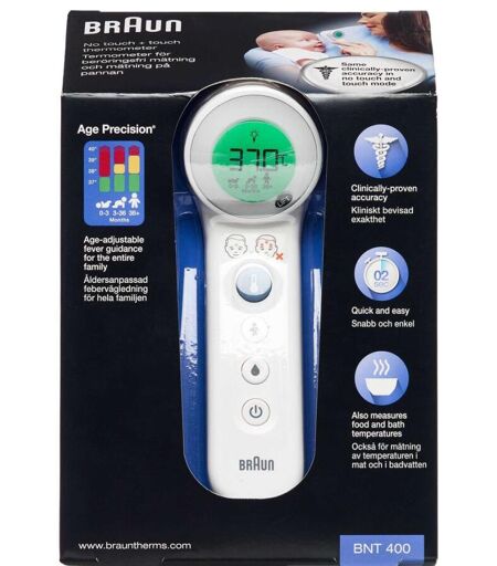 Braun 2i1 No Touch Termometer er særligt velegnet til, når barnet sover, til selvmåling eller til kryds-reference-målinger. Braun 2i1 No Touch Termometer bruges til praktisk, hurtig, hygiejnisk og præcis temperaturtagning for hele familien. Bemærkning Alders præcision med farvekodet display.Måling på pande, genstande eller i væske.Nem at bruge og øjeblikkelig måling.Anbefalet til spædbørn, børn og voksne. ...