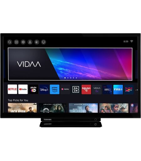 Toshiba 24WV3463DAZ tilbyder næsten ubegrænset underholdning, for udover at modtage tv-programmer kan du få adgang til forskellige portaler og tjenester med de mange smart-tv-funktioner. Panelet på 60 cm (24") viser realistiske og fascinerende farver og har en WXGA-opløsning (HD-Ready) (1.366 x 768 pixel) – så det er udstyret til indhold i høj opløsning og producerer et detaljeret billede med fantastiske farver og mere skarphed. Desuden er en tredobbelt tuner tilgængelig til at modtage og vise satellit-, kabel- eller jordbaserede signaler - takket være automatisk kanalsøgning og talrige muligheder for personlig tilpasning hurtigt og nemt. Derudover kan 24WV3463DAZ som et smart-tv med VIDAA-operativsystem få adgang til adskillige onlinefunktioner, der forbedrer den sædvanlige tv-oplevelse. Uanset om det er streamingtjenester, mediebiblioteker fra forskellige udbydere eller applikationer og søgefunktioner via internettet - der er noget for enhver smag. Yderligere højttalere er ikke påkrævet. 24WV3463DAZ leveres med den: 5-watt stereohøjttalerne med Dolby Audio gør alt indhold endnu mere fordybende og autentisk. ...