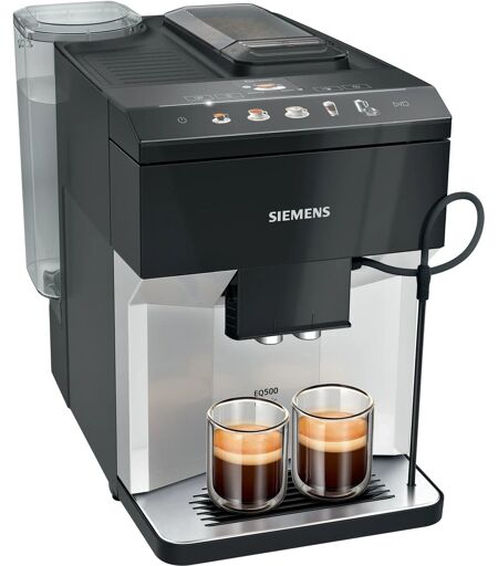 Siemens TP511R01 EQ.500 classic er en fuldautomatisk kaffemaskine, der sikrer en vellykket kaffeoplevelse hele vejen rundt. SensoFlow-systemet sikrer altid en ideel og konstant bryggetemperatur. Det innovative TFT-farvedisplay passer ikke kun harmonisk ind i den fuldautomatiske kaffemaskines visionære design, det er også særligt praktisk at betjene. Med oneTouch-funktionen serverer EQ.500 den perfekte kaffenydelse nemt og bekvemt med et tryk på en knap. Med den let tilgængelige servicedør på forsiden af enheden er nem vedligeholdelse og hurtig rengøring mulig. Uanset om det er en stor, fedtfattig latte macchiato, en mild cappuccino eller en ekstra stærk espresso: I dag mere end nogensinde er kaffenydelse et udtryk for ens egen personlighed og individuelle livsstil. Med det unikke iAroma-system tilbyder Siemens fuldautomatiske kaffemaskiner altid den bedste drikkevarekvalitet. Samspillet mellem holdbar keramisk kværn, intelligent øjeblikkelig vandvarmer, vandpumpe og højteknologisk bryggeenhed skaber teknisk perfektion fra bønne til kop. ...