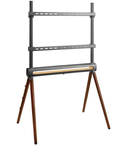 Elia Studio Shine Wood er et fritstående standsystem, som er kendetegnet ved sit unikke "staffelidesign". Den er velegnet til skærme med en skærmdiagonal på 102 - 178 cm (40 - 70"). VESA-standarden understøttes fra min. 200 x 200 mm til maksimalt 600 x 400 mm. Højdekompensation på monteringssiden sikrer en optimalt justeret slutposition. Kablet styres ved hjælp af kabelclips på bagsiden langs de koniske fødder. Den integrerede LED-omgivende belysning kan justeres i alsidige belysningsstemninger ved hjælp af den praktiske fjernbetjening. Den maksimale nyttelast er 40 kg. ...